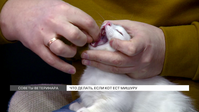 Если вы заметили, что ваша кошка стала грустной, а до этого что-то жевала, то можно самостоятельно проверить, что случилось. Откройте животному рот, приподнимите язык и посмотрите под корень – часто дождик цепляется именно там. Вы, конечно, не вылечите животное, но сможете вовремя диагностировать проблему и отвезти питомца к врачу.