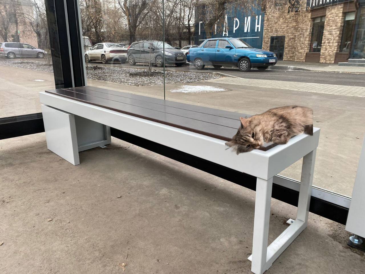 В Telegram-канале администрации Лилю называют пушистым контролером, заявляя, что кошка одобрила новую «умную» остановку. Говорят: смотрите, судя по фото, в ожидании автобуса на этой лавочке удобно не только сидеть, но и лежать.