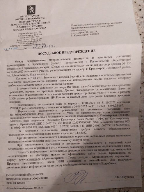 5 декабря волонтеры частного приюта для бездомных животных «Алькин дом» обратились к красноярцам с просьбой о помощи. У приюта скопился долг в 174 тысячи рублей за аренду муниципального помещения. Администрация города вынесла приюту досудебное предупреждение.