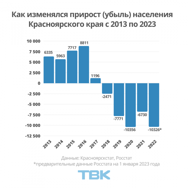То есть, согласно статистике, население региона за 2022 год сократилось на 10 326 человек. Это сравнимо с пандемийным годом – тогда, по данным Красноярскстата, общая убыль населения составила 10 356 человек. В 2021 население уменьшилось на 6 730 человек. Последний раз прирост населения в Красноярском крае, по данным статистиков, был в 2017 году – тогда численность жителей увеличилась на 1 196 человек.