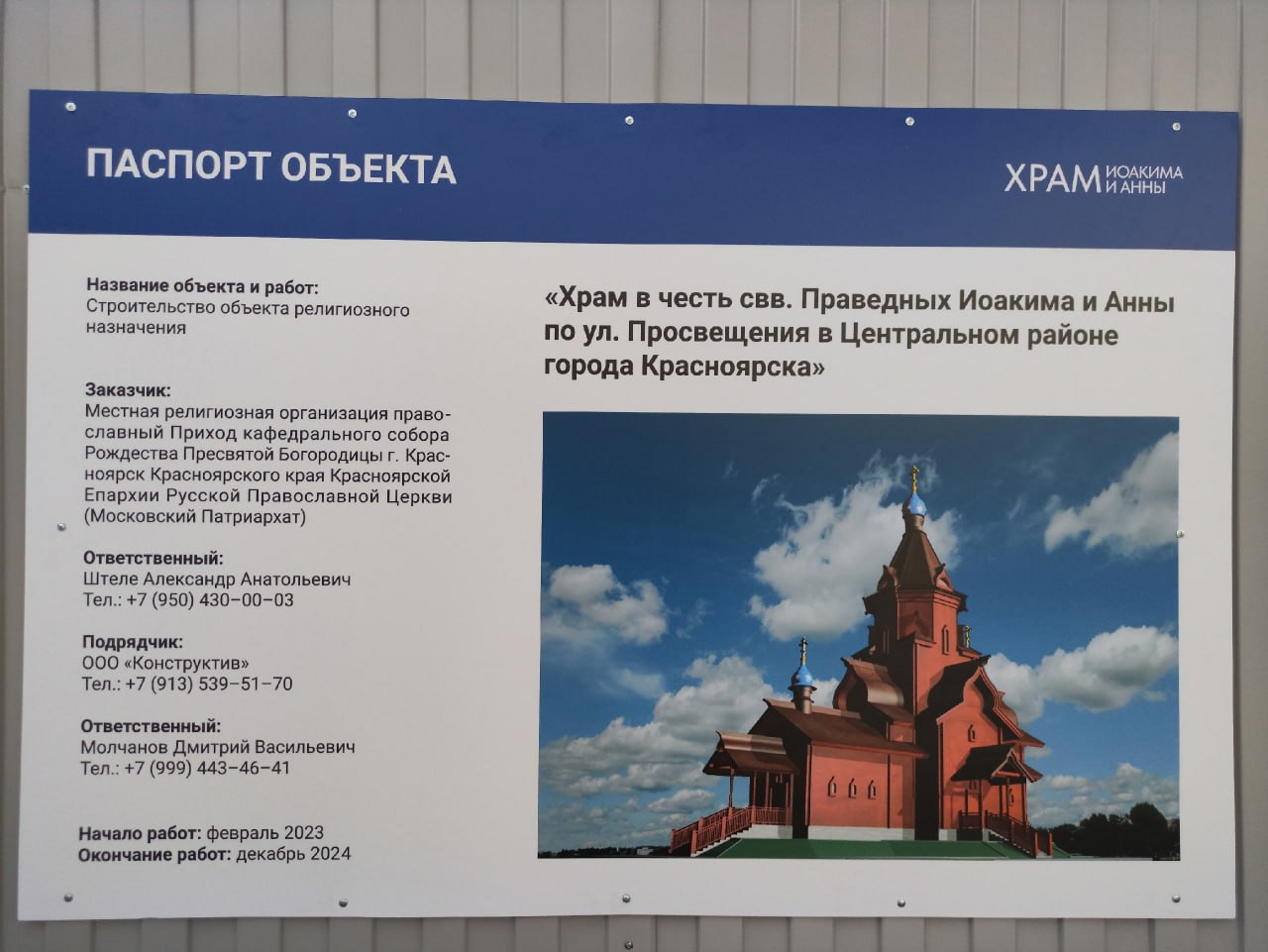 Храм будет выполнен из клееного бруса. Высота от земли до кончика креста – 27 метров. Вокруг храма будет живая изгородь, лавочки и детская площадка. Площадь храма составит 188 кв. м, он будет рассчитан на 100 прихожан. Завершить строительство планируют в декабре 2024 года.