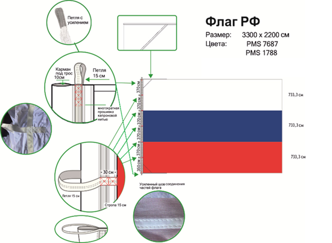 Тендер появился на сайте Госзакупок. В документах говорится, что 3 флага стоят 580 тысяч рублей за штуку, еще 7 – 608,5 тысяч за штуку. Триколоры будут одинакового размера – 33х22 м, разница только в плотности.