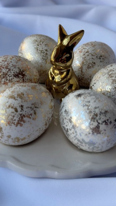 Можно нанести «клей» на ладонь, а затем растереть в ней лист потали. Сверху положить яйцо и пальцами «втереть» металлические хлопья в его поверхность. Дать яйцу высохнуть.
