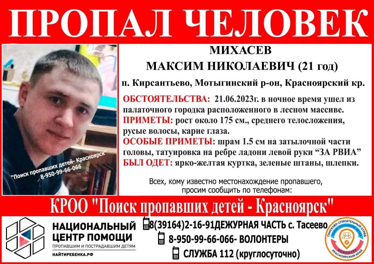 21-летний Максим Михасёв пропал в ночь с 20 на 21 июня. Он вместе с командой был на пожаре в Мотыгинском районе недалеко от поселка Кирсантьево. Утром Максима в палатке уже не было, говорят коллеги. Эту информацию ТВК подтвердил начальник авиаотделения Тасеевского лесопожарного центра, в котором работает Максим.