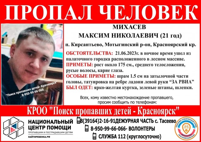 Всех, кому известно местонахождение Максима Михасёва, просят позвонить по телефонам: 8(39164) 2-16-91 – дежурная часть села Тасеево; 8 (950) 996-60-66 – волонтеры или 112.