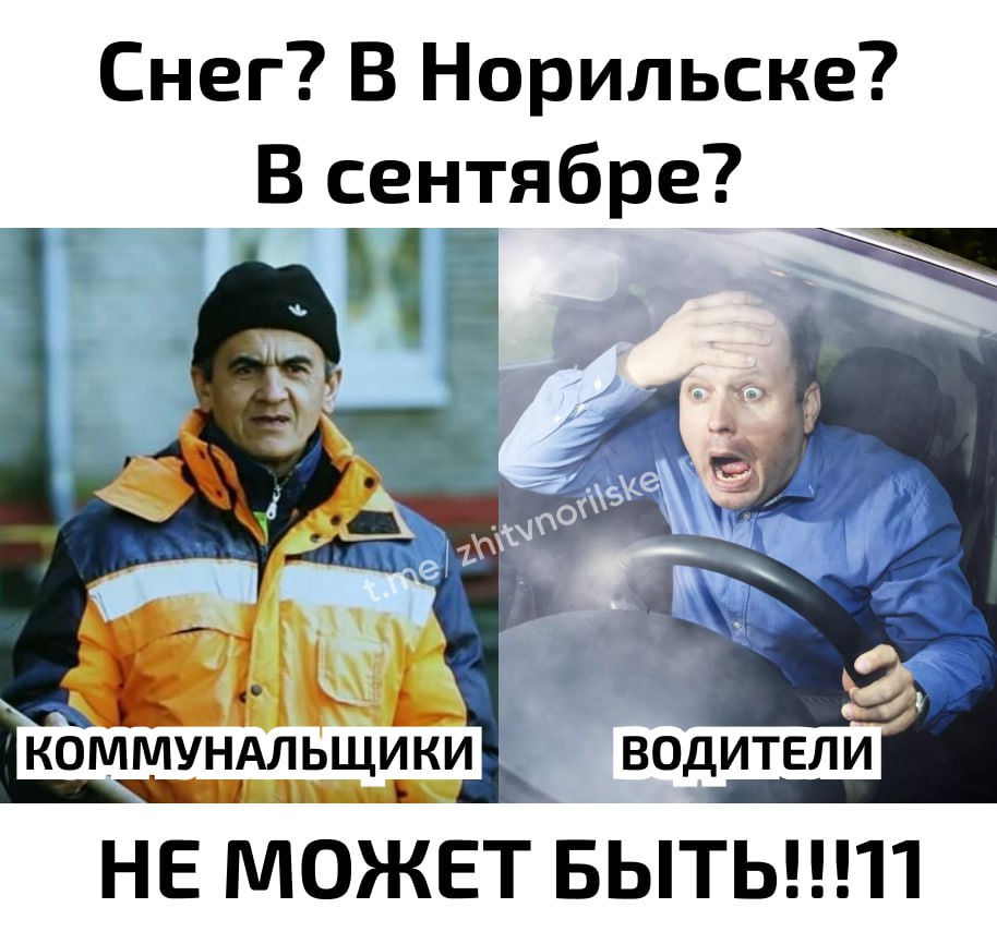 В Норильске выпал снег: дети лепят снеговиков, а город встал в пробки