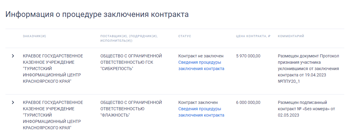 Большие триколоры для флагштока уже заказывали весной 2023 года за 6 млн рублей. После определения победителя один из участников торгов подал жалобу в Антимонопольную службу. В итоге поставщик «Сибкрепость» отказался от контракта с ТИЦ. Документы заключили с компанией «Флажность» из Пензы. На сайте Госзакупок контракт значится, как исполненный – «Флажность» поставила 10 флагов.
