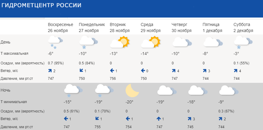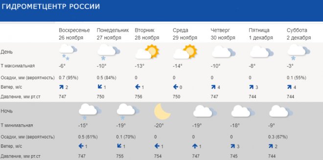 Среда 29 ноября будет облачной, -14°C. Ночью опустится до -19°C. 30 ноября, четверг, днем будет -10°C, а ночью -18°C, без осадков.