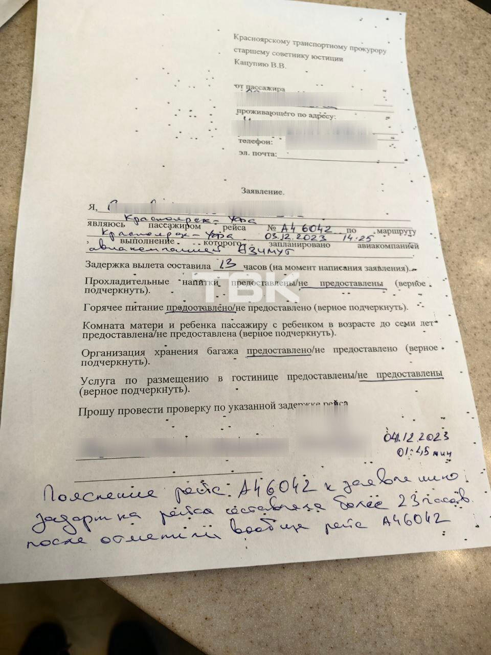 После случившегося все пассажиры рейса Красноярск – Уфа написали заявления в транспортную прокуратуру. Только после этого, по словам Наиля, людей увезли в одну из гостиниц Красноярска за счет авиакомпании «Азимут», которая должна была выполнять рейс. На момент публикации новости пассажиров отправили обратно в аэропорт, хотя, как рассказал Наиль, самолет в Уфу отменили, а другого варианта людям не предложили.«Они предлагают гостиницу за свой счет, ссылаясь на то, что авиакомпания оплатит потом. Очень много вопросов. Официальный представитель авиакомпании так и не дозвонилась до своих коллег и просто оттягивала время», – рассказал ТВК мужчина.