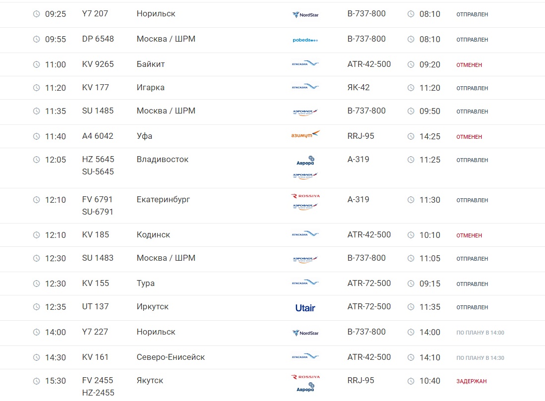 Судя по онлайн-табло аэропорта, на момент публикации новости рейсы на вылет в Байкит, Уфу и Кодинск отменены. Еще 3 задержаны – это рейсы в Якутск и Новосибирск. Также на прибытие в красноярский аэропорт отменены рейсы из Абакана, Кодинска и Байкита, рейс из Якутска – задержан.