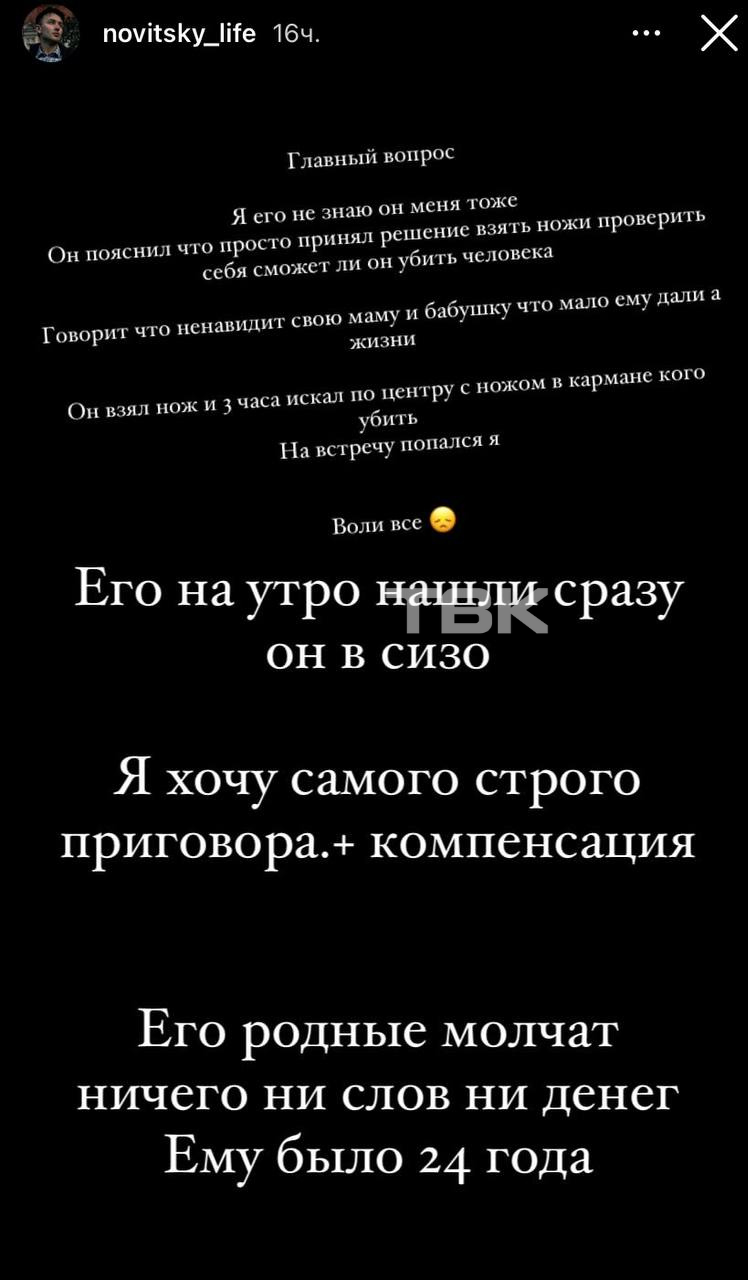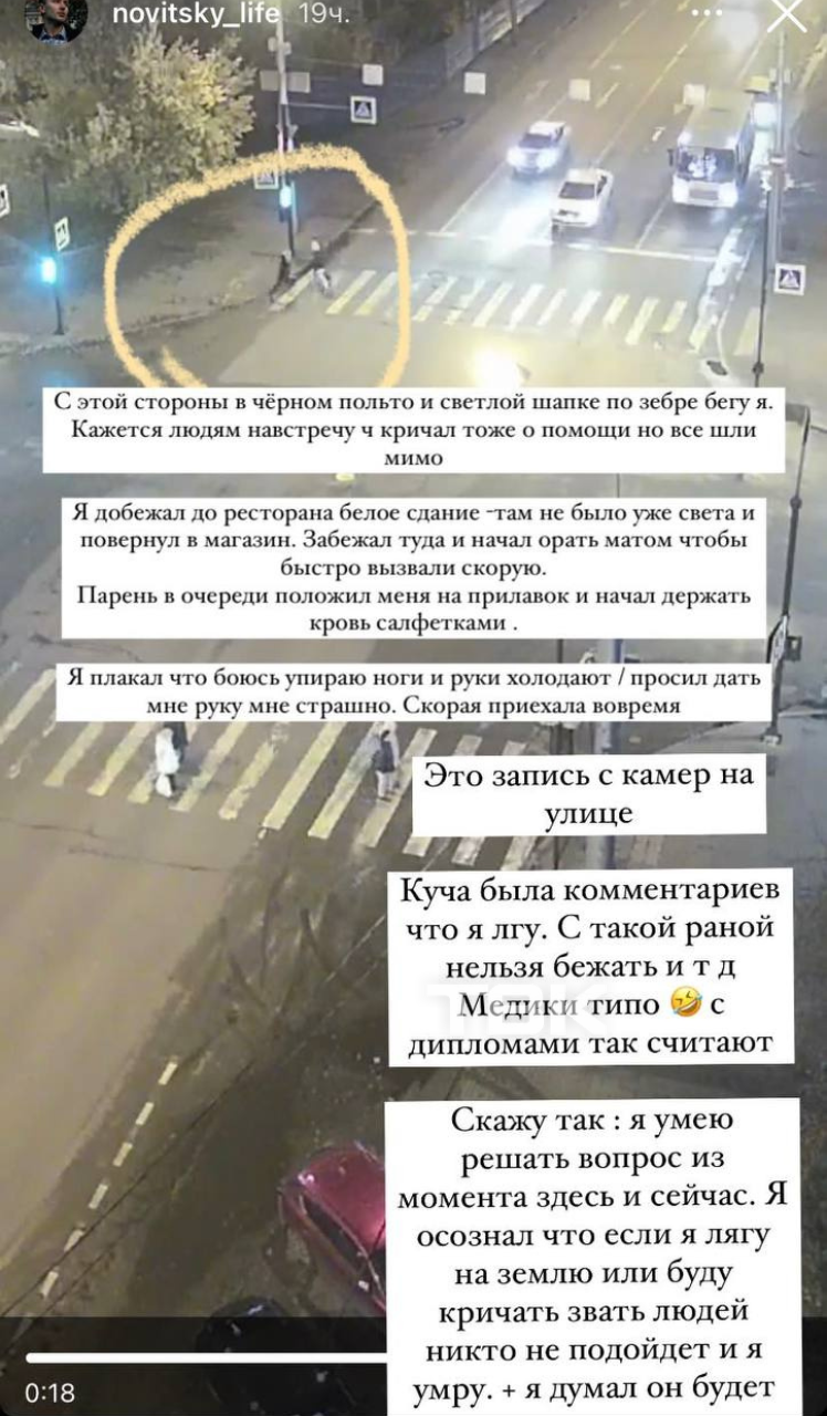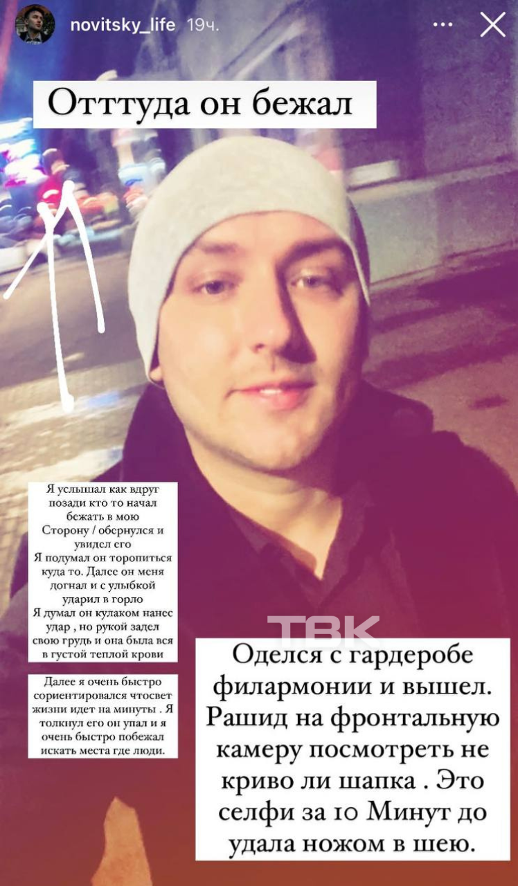 «Я думал, он торопится куда-то. Далее он меня догнал и с улыбкой ударил в горло. Я думал, он кулаком нанес удар, но рукой я задел свою грудь, и она была вся в густой и теплой крови. Далее я очень быстро сориентировался, что счет жизни идет на минуты. Я толкнул его – он упал – и я очень быстро побежал искать места, где есть люди», – рассказывал тогда о нападении Новитский.