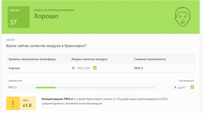 При этом на сайте IQAir указано, что к 20 марта этого года частиц PM2.5 в красноярском воздухе уже значительно меньше – 8.5 мкг/м³. По стандартам Всемирной организации здравоохранения норма – 5 мкг/м³.