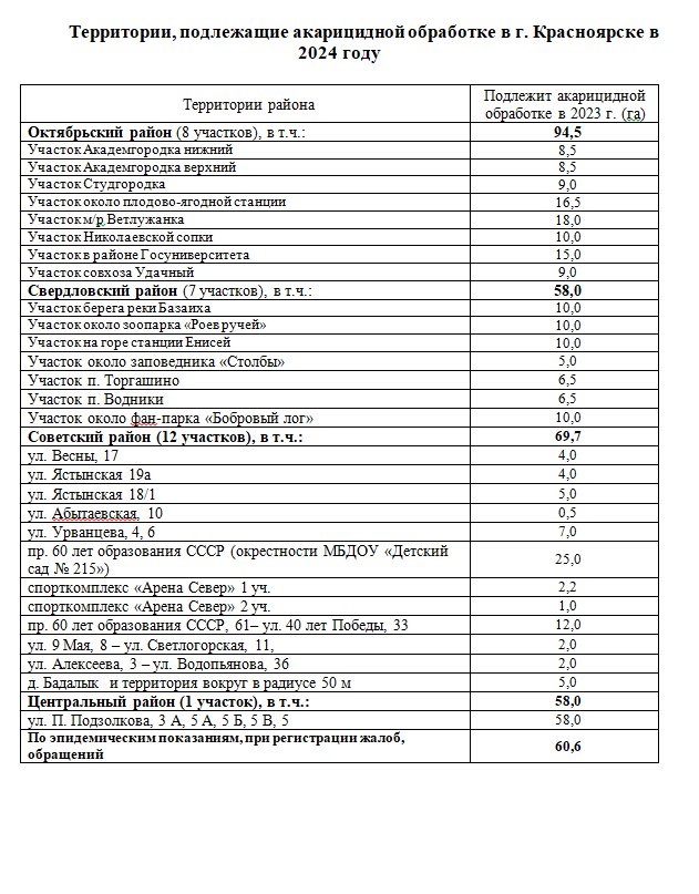 Стало известно, какие территории в Красноярске обработают от клещей. Как и в прошлом году, мэрия планирует обработать от членистоногих 460 га земли.