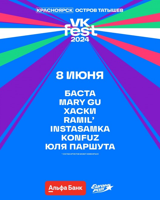 В список хедлайнеров музыкального фестиваля от «ВКонтакте» в Красноярске попали рэперы Баста и Хаски, Instasamka. Кроме того, свои песни исполнят, Konfuz (известен по песне «Кайф ты поймала»), Ramil’ («Сияй») Mary Gu («Не влюбляйся», «Папа») и Юля Паршута.