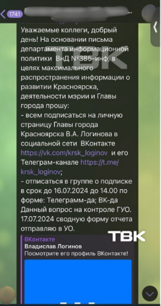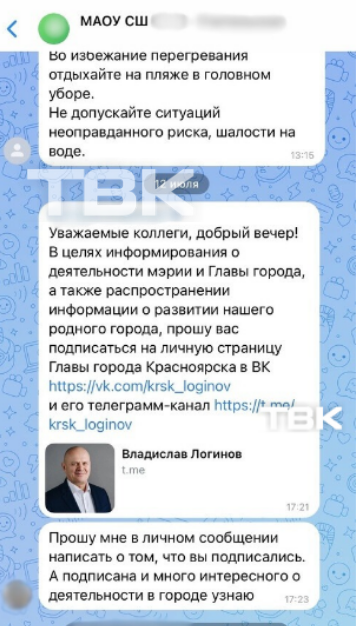 12 июля сотрудники школ и детских садов массово стали получать «рекомендацию» о подписке на Telegram-канал и группу во Вконтакте мэра. В редакцию ТВК подтверждение этому отправили несколько учителей.
