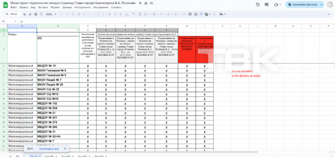 При этом Telegram-каналы также публикуют таблицу с отчетом по каждому учреждению, сотрудникам которого «порекомендовали» подписаться на соцсети мэра. По их данным, в каждой графе отслеживалось фактическое количество сотрудников и сколько именно подписались на соцсети. В распоряжение ТВК также попала эта таблица. К моменту публикации новости данные выглядят так: