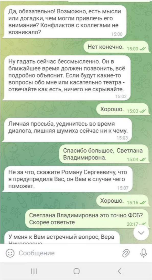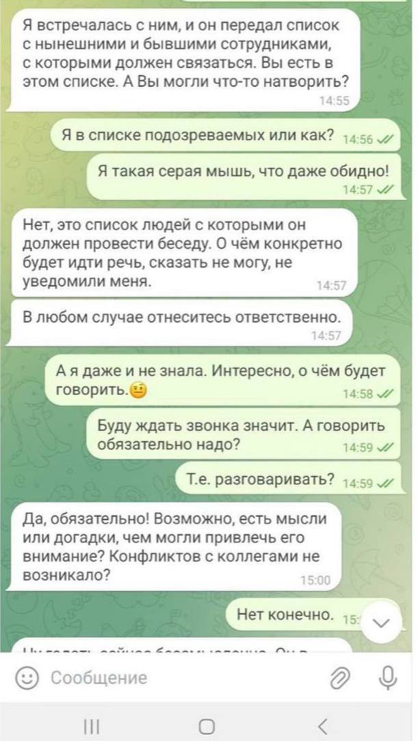 Сперва мошенники попросили найти место, где нет людей: «сами понимаете, разговор приватный», сказали они. Также нужно было выйти на улицу и «ни в коем случае не класть трубку».«Началось все в 15:30 с сообщения от “директора”. Я поверила на 100% ,что это мне пишет именно директор. Минут через 20 мне позвонили из ФСБ. На аватарке стоял герб России. Сначала разговор был с инспектором», – делится мама Анастасии Куимовой.