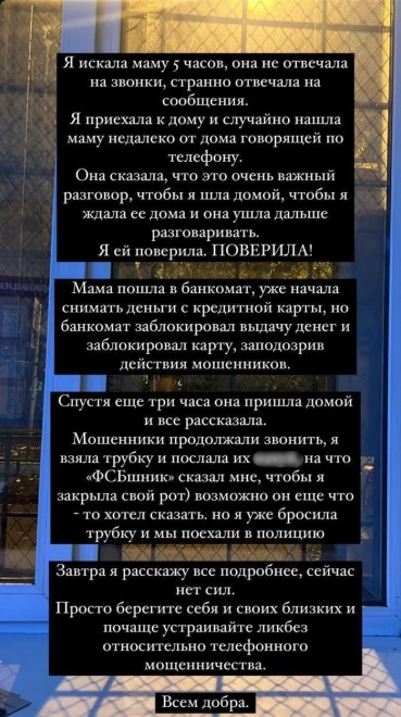 Спустя 3 часа женщина вернулась домой и рассказала подробности истории. При этом мошенники продолжали звонить. На этот раз им ответила Анастасия.«Я искала маму 5 часов. Я приехала к дому и случайно нашла ее, говорящей по телефону, недалеко от подъезда. Она сказала, что это очень важный разговор и чтобы я ждала ее дома. Я ей поверила. После этого мама пошла снимать деньги с кредитной карты, но банкомат заблокировал выдачу средств, а также саму карту, заподозрив действия мошенников», – делится актриса Анастасия Куимова.