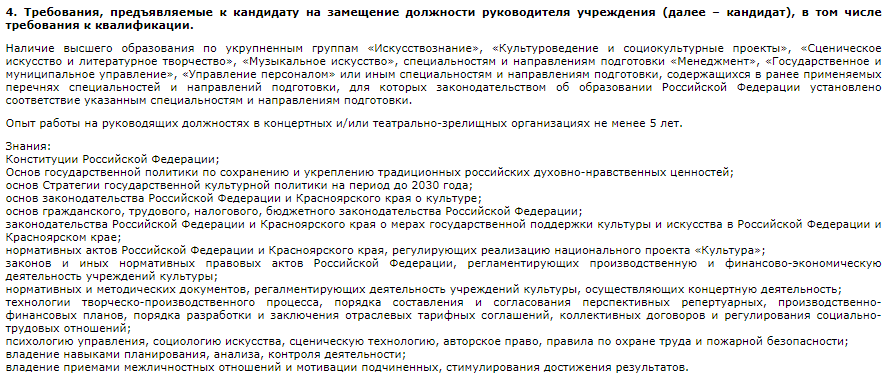 Конкурс на должность генерального директора краевой филармонии объявили в Красноярске. Среди требований к кандидату – знание Конституции РФ и основ «политики по сохранению и укреплению традиционных российских духовно-нравственных требований».