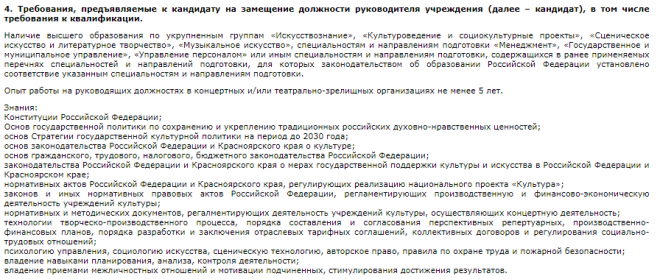 О конкурсе на должность объявил в своем telegram-канале министр культуры края Аркадий Зинов. Среди требований к кандидату – наличие профильного высшего образования и опыт работы на руководящих должностях в концертных или театрально-зрелищных организациях не менее 5 лет.