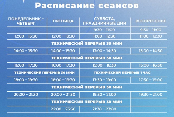 Суббота и воскресенье по 2 сеанса в день – с 17:00-19:00 и 20:00-22:00.