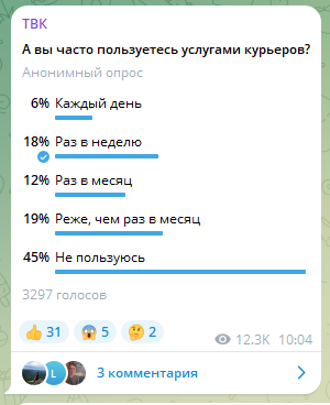 «Если клиент не выходит на связь, заказ отменяется, он остается у тебя. По правилам, утилизировать надо. Но “Яндекс” в этом плане лояльный, ты можешь заказ себе присвоить. Это случается очень редко. У меня за все 3 года раза два такое было. Это были мелкие заказы – молоко, яйца», – вспоминает Александр.По данным сервисов по поиску работы, курьеры сейчас входят в десяток самых востребованных сотрудников. Услуги доставки и, правда, пользуются спросом. Судя по опросу, который мы провели в соцсетях ТВК, к помощи курьеров прибегают больше половины (56%) наших подписчиков. 19% опрошенных пользуются услугой достаточно редко. Еще 12% вызывают доставку раз в месяц. 19% – раз в неделю