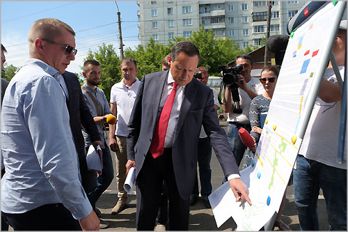 Роман Скрипальщиков докладывает о ходе дорожного ремонта бывшему главе Красноярска Эдхаму Акбулатову, 2017 год.