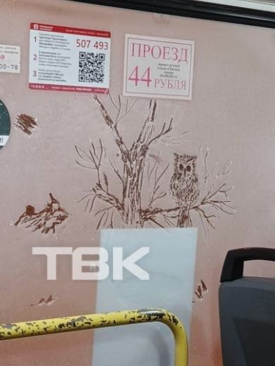 Работает печка в автобусе или нет уже больше недели проверяют на себе пассажиры. Как только в красноярск пришел устойчивый минус. А кто то, видимо, восхитившись толстой наледью на окнах автобусов, даже рисует целые ледовые картины.