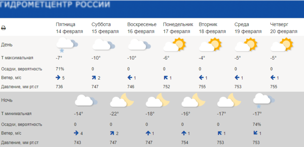 В субботу, 15 февраля, днем будет -10°С, без осадков, ветер 2 м/с. К ночи похолодает до -22°С, снега не ожидается.Утром в воскресенье синоптики обещают -10°С, без осадков. Ночью снова ощутимо похолодает, до -18°С.