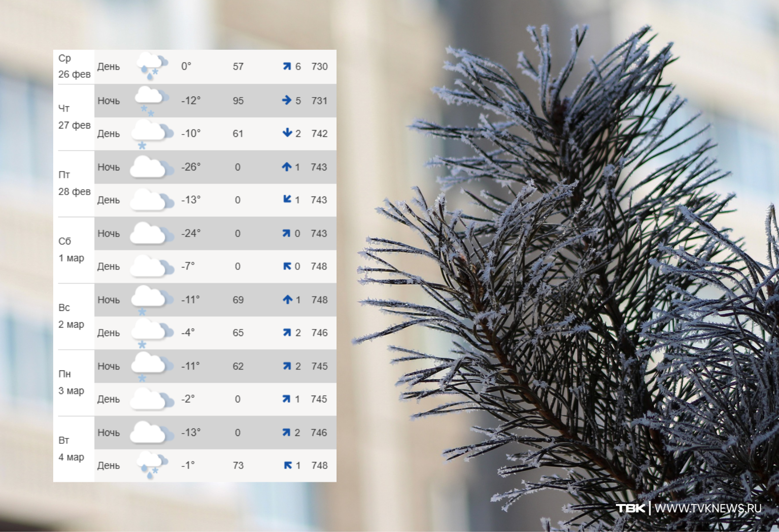 В ночь с 27 на 28 февраля в город и вовсе придут морозы – до -26°С. В пятницу, 28 февраля синоптики обещают -13°С днем и -24°С ночью.