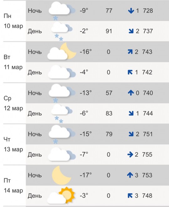 По данным Гидрометцентра, в понедельник, 10 марта, днем будет до -2°C, возможен снег. Ночью – до -16°C.