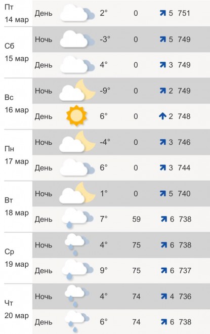 Рабочая неделя также начнется с комфортных температур. Синоптики прогнозируют от +6°C до +9°C днем и от +1°C до +4°C ночью.В субботу, 15 марта, синоптики обещают до +4°C. Ночью температура опустится до -9°C. Будет пасмурно. В воскресенье, 16 марта, прогнозируется до +6°C, в ночное время – до -4°C.