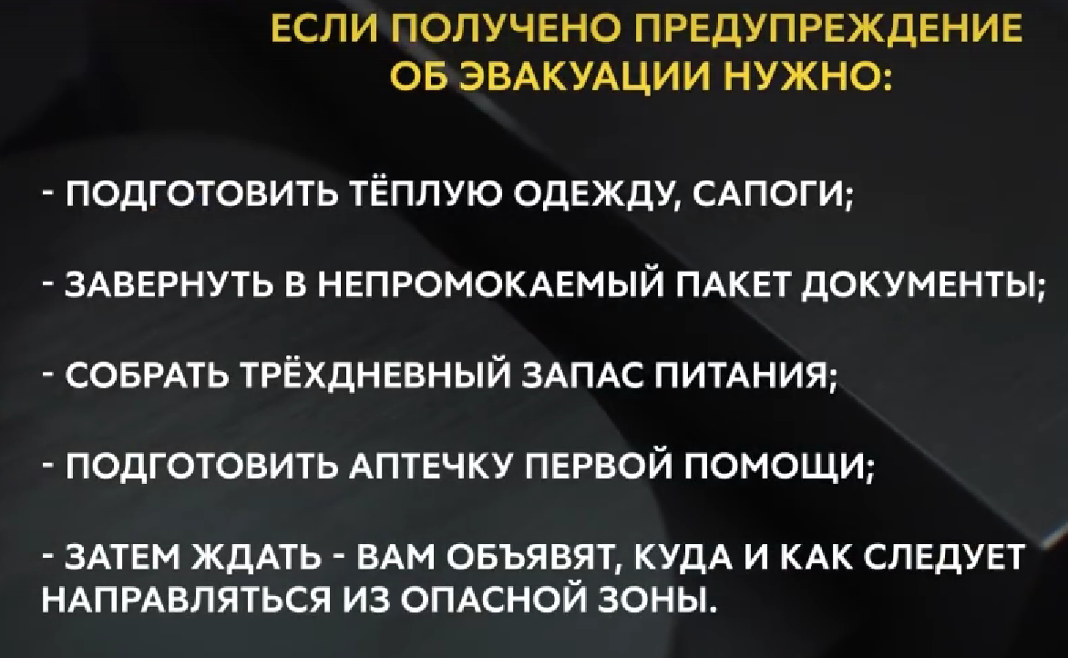 Для проживания пострадавших от паводков будут подготовлены пункты временного размещения. По телевидению, радио, через интернет следите за прогнозами погоды и прогнозами возможных чрезвычайных ситуаций. После спада воды остерегайтесь порванных и провисших электрических проводов. Категорически запрещается использовать продукты питания, попавшие в воду, и употреблять воду без соответствующей санитарной проверки. Перед входом в жилище после спада воды предварительно откройте двери и окна для проветривания, не пользуйтесь открытым огнем до проветривания (возможна взрывопожароопасная концентрация газов), запрещается включать любые электроприборы до проверки исправности электрических сетей.