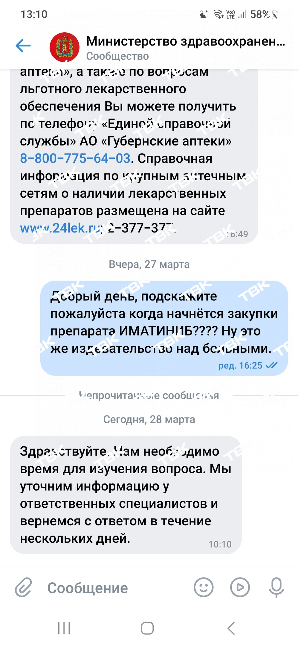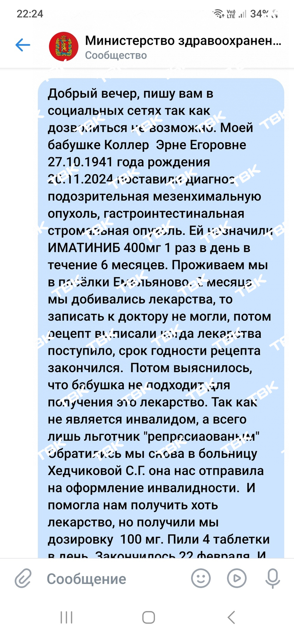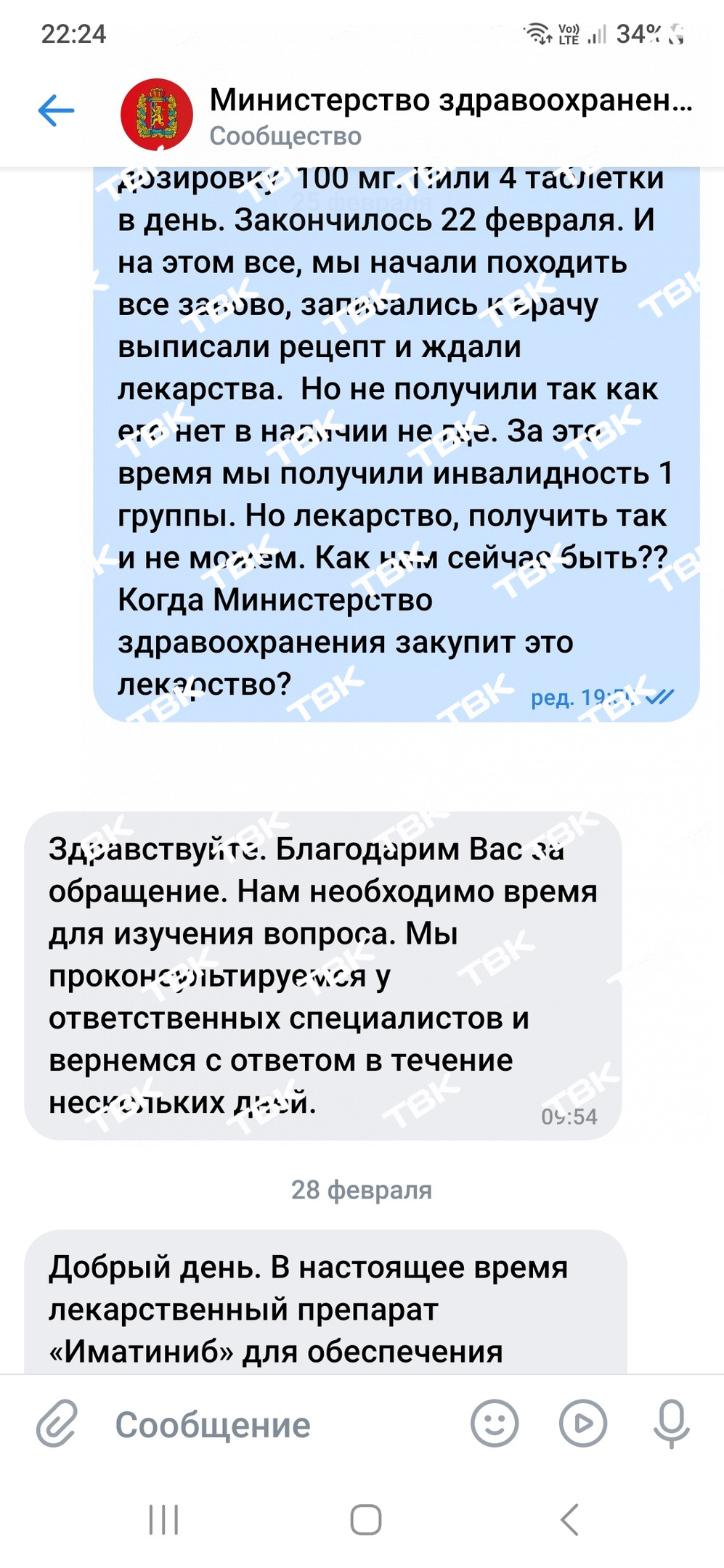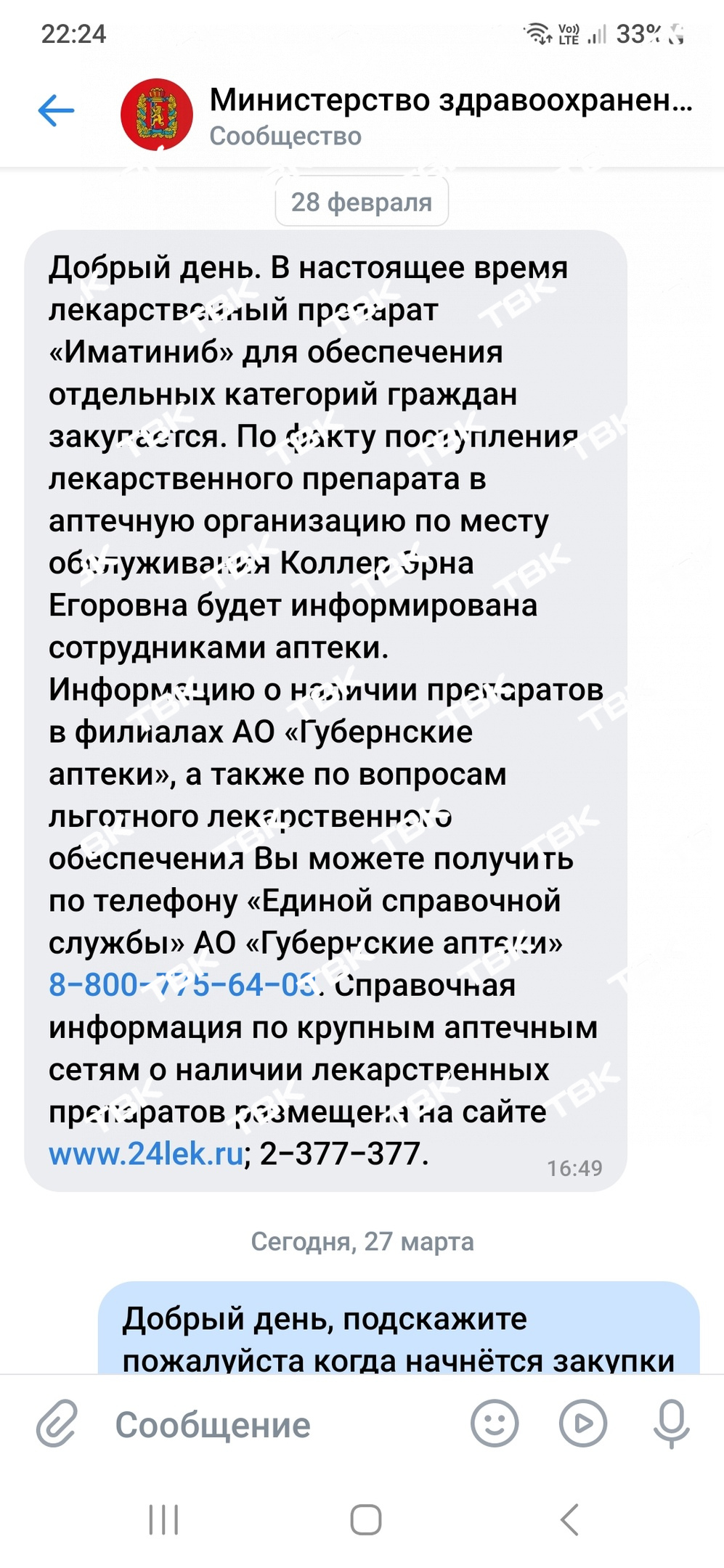 ТВК обратились в Минздрав Красноярского края с вопросами, на каком этапе находится закупка препарата «Иматиниб» и когда его смогут получить льготники. Опубликуем ответ сразу, как только его получим.