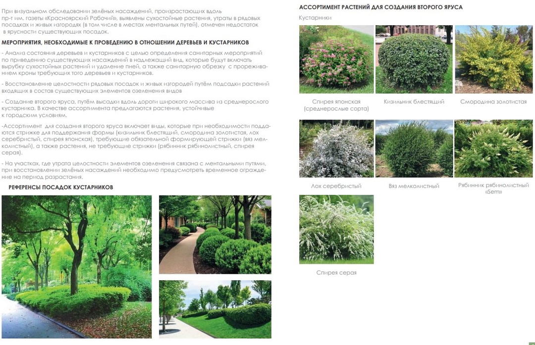 Вдоль проспекта имени газеты Красноярский Рабочий создадут «зеленый коридор», состоящий из 2 ярусов разной высоты – деревьев, газонов и растений для сезонного размещения. Уже существующие деревья и живые изгороди должны быть сохранены, вдоль дороги нужно высадить широкий массив кустарника.