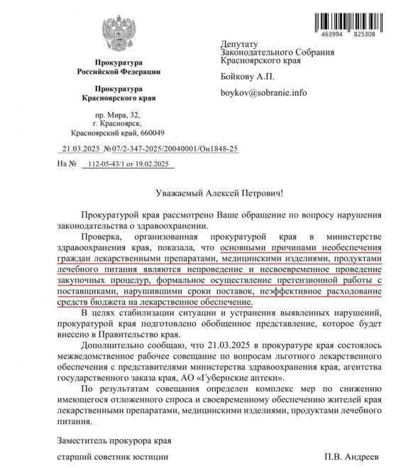 Прокуратура провела проверку в краевом Минздраве по запросу Алексея Бойкова. Ведомство выяснило, что основными причинами, из-за которых люди несколько месяцев не могут получить льготные лекарства, изделия и спецпитание, являются «непроведение и несвоевременное проведение закупочных процедур, формальное осуществление претензионной работы с поставщиками, нарушившими сроки поставок, а также неэффективное расходование средств бюджета на лекарственное обеспечение».