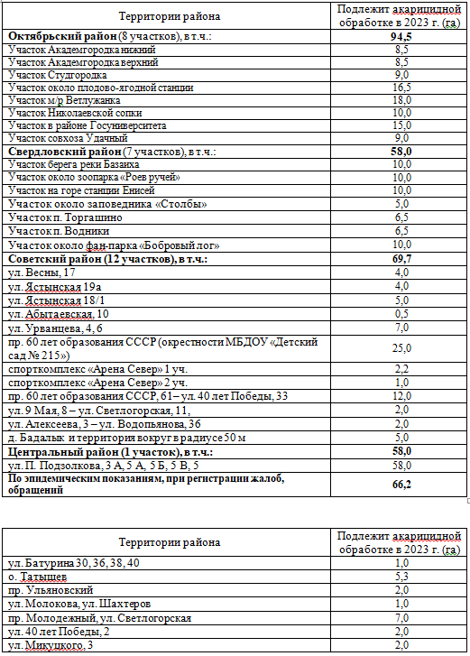 Всего в этом году на обработку планируют потратить 1,7 млн рублей из бюджета края, а также средства из бюджета города. За свой счет обработку от членистоногих проведут «Роев Ручей», фан-парк «Бобровый лог», базы отдыха, частные организации и предприятия.Кроме того, в городе будут обрабатывать участки, не вошедшие в перечень Роспотребнадзора, но на которые жалуются красноярцы. Обращения можно оставить через службу «005» по телефону: 223-85-05.