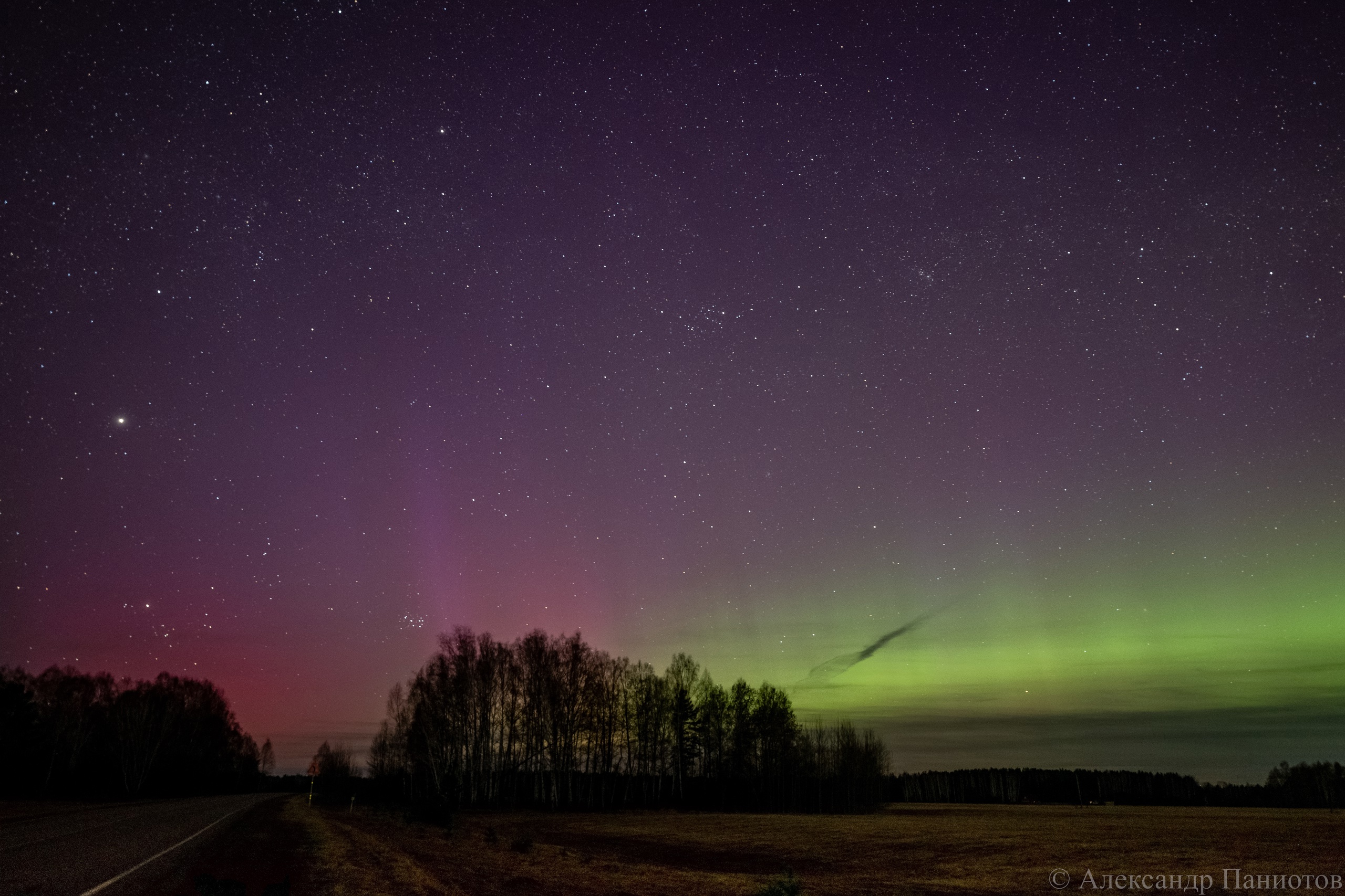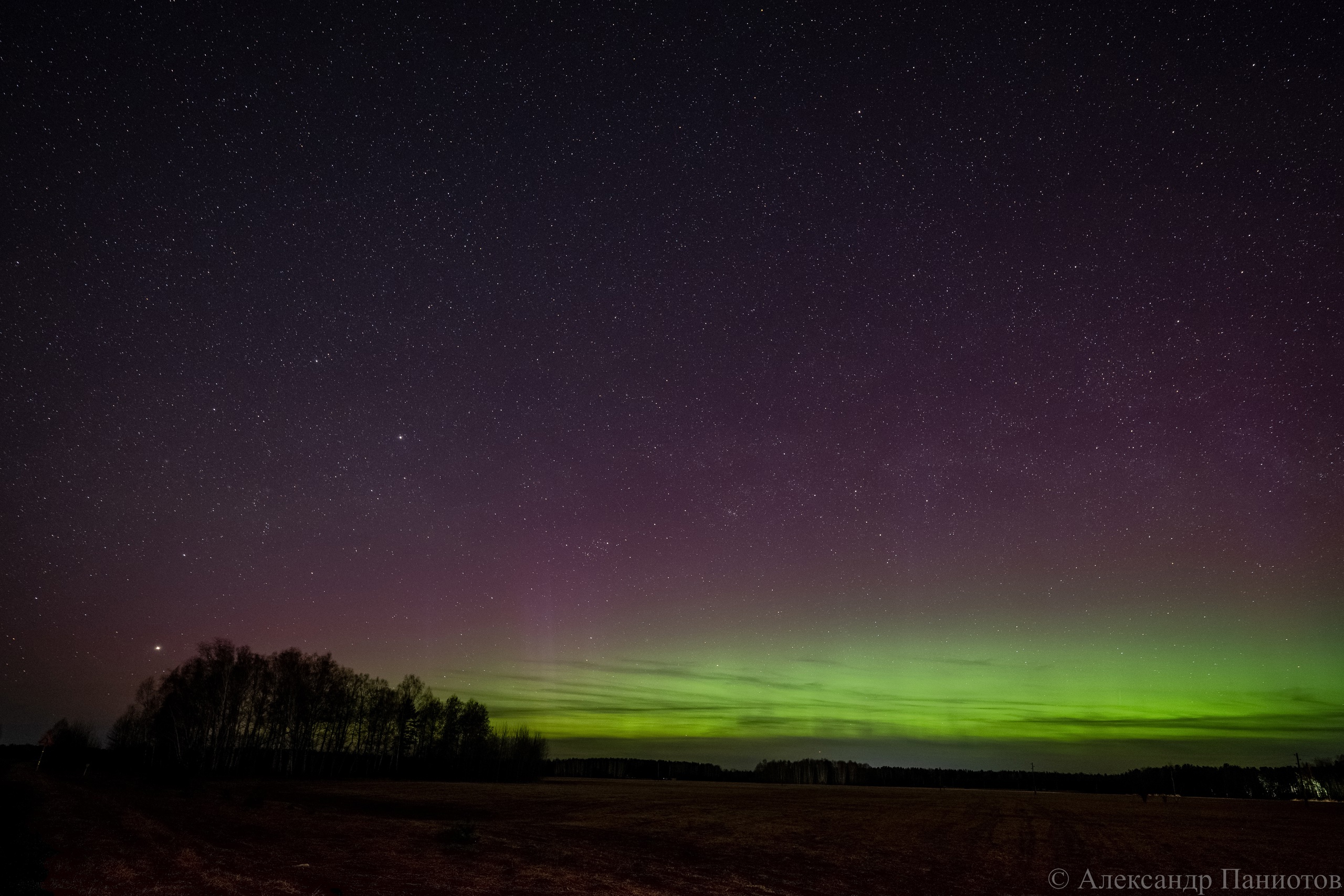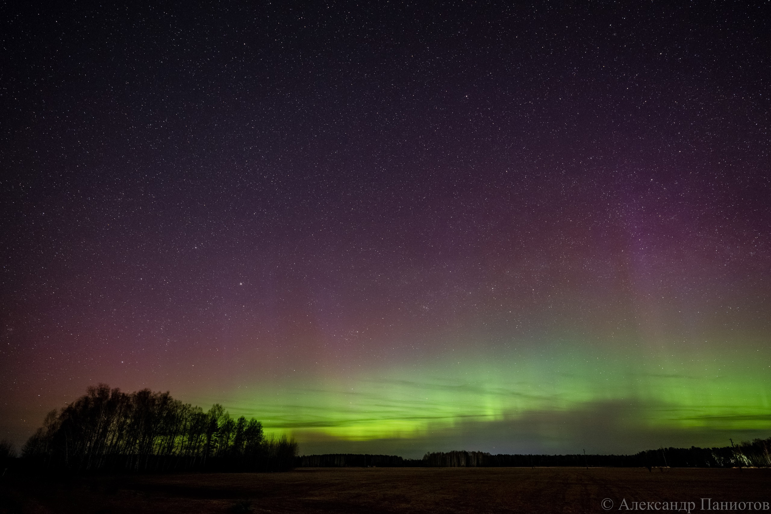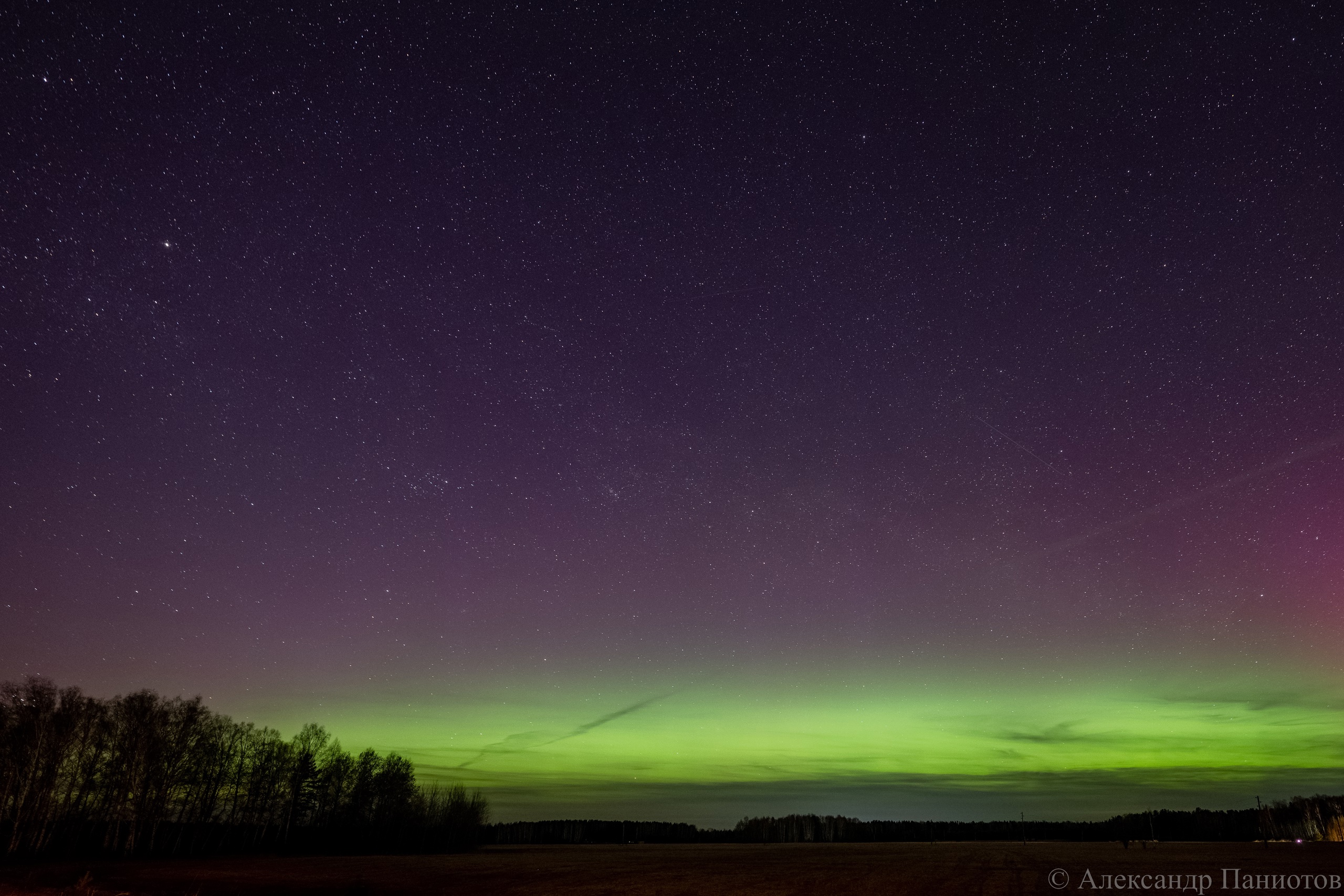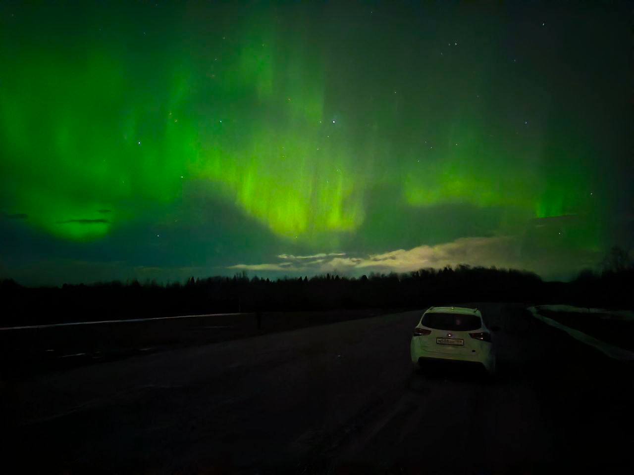 «Пока вы спали, мы наблюдали! Потрясающая красота, это что-то невероятное у нас в микрорайоне было», – пишет Андрей.Переливы в небе видели и за городом. Северное сияние под Красноярском успел сфотографировать Александр Паниотов.