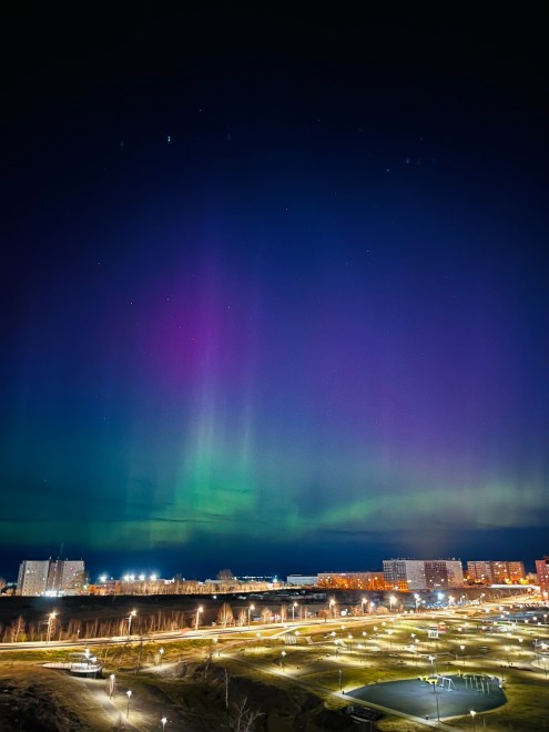 Северное сияние возникает, когда после вспышек на Солнце в магнитное поле Земли попадают большие скопления заряженных частиц. Их еще называют «солнечным ветром». Эти частицы устремляются к полюсам, где сталкиваются с молекулами нашей атмосферы.Сейчас в Красноярске сильная магнитная буря. 16 апреля возмущения на Солнце достигали 7 баллов. В четверг, 17 апреля, днем прогнозируют умеренную бурю в 6 баллов.