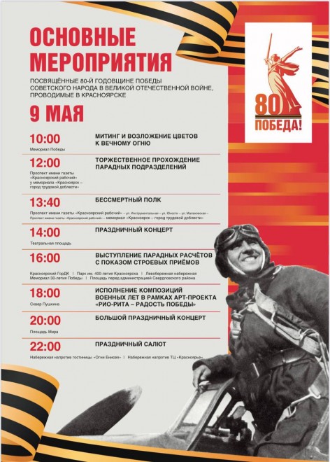 В этом году красноярцы смогут участвовать в шествии «Бессмертного полка» на Красрабе и посмотреть фейерверк. Афишу мероприятий к 80-летию празднования Победы опубликовал в своем telegram-канале руководитель администрации губернатора края Сергей Пономаренко.