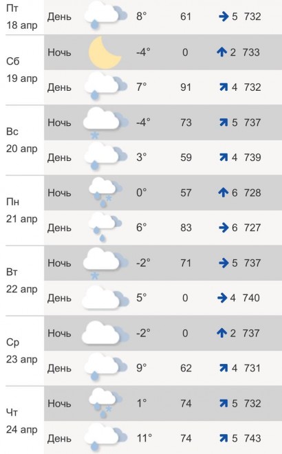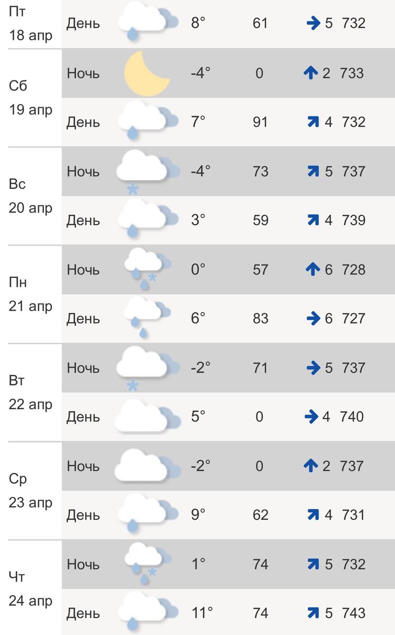 В воскресенье, 20 апреля, синоптики обещают до +3°C днем и до 0°C ночью. Прогнозируются дожди и снег.В субботу, 19 апреля, в дневное время прогнозируется до +7°C. Будет пасмурно и дождливо. Ночью – до -4°C, пойдет снег.
