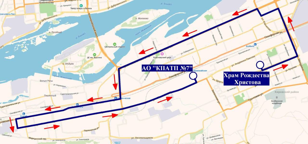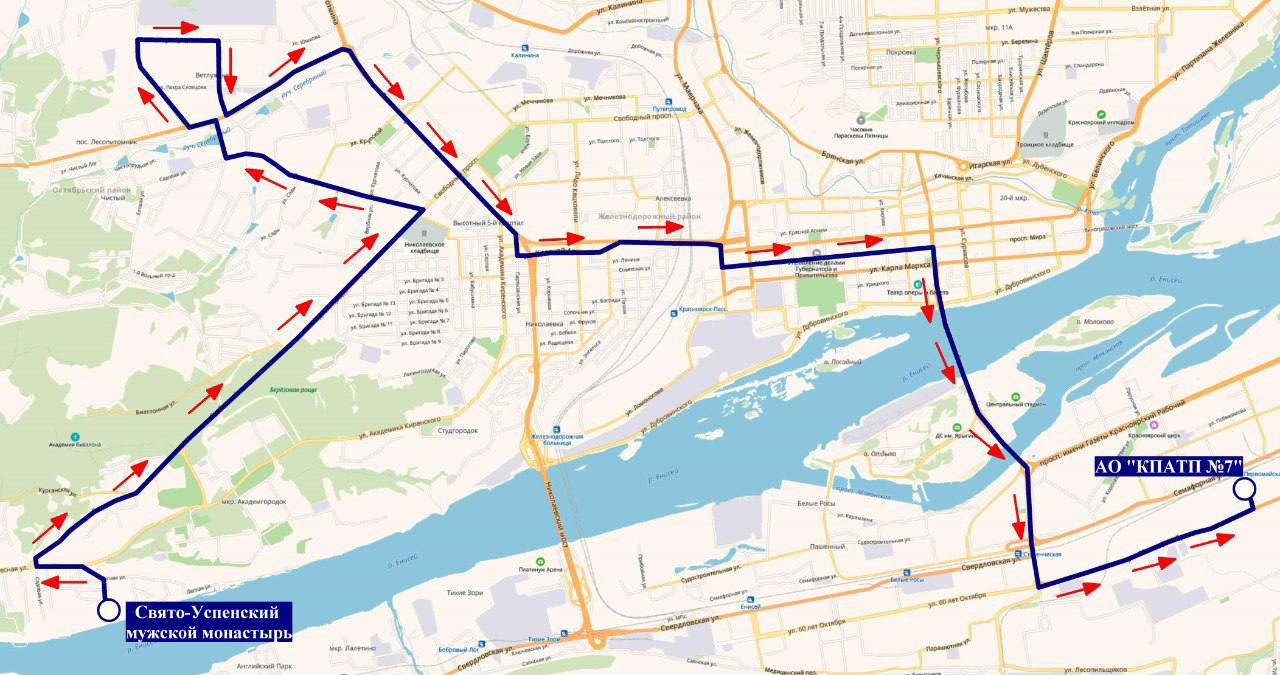 Подробную информацию о движении автобусов можно узнать по телефонам: 223-55-56, 256-84-00 или на сайте «Красноярскгортранса».Единственный рейс от Свято-Успенского мужского монастыря поедет по Свободному и свернет к Ветлужанке. Затем автобус отправится в центр и по Коммунальному мосту переедет на правый берег, где по 60 лет Октября и Павлова доедет до автопарка.