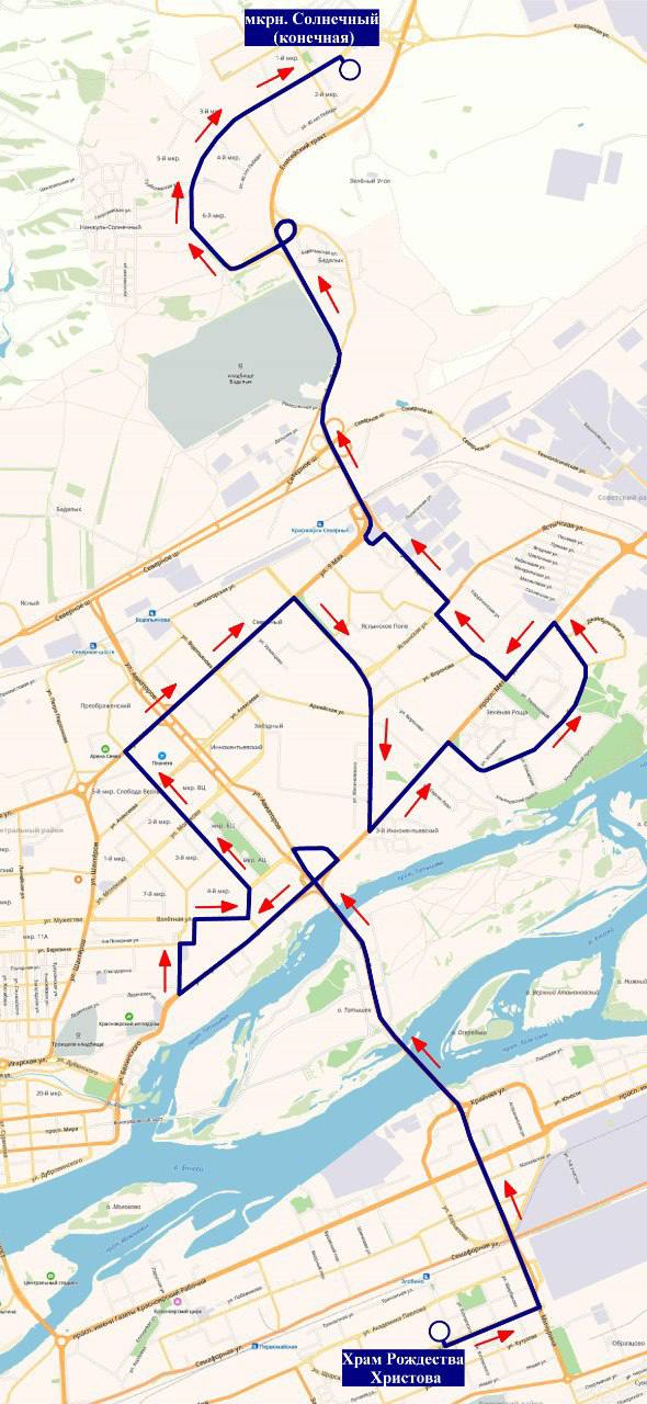 Второй маршрут от храма отправится по Красноярскому рабочему до Предмостной площади. Там автобус повернет на Свердловскую и доедет до начала улицы 60 лет Октября. По ней же он вернется в автопарк на Павлова.