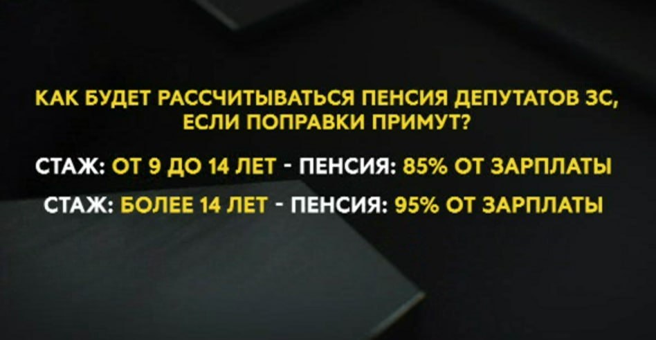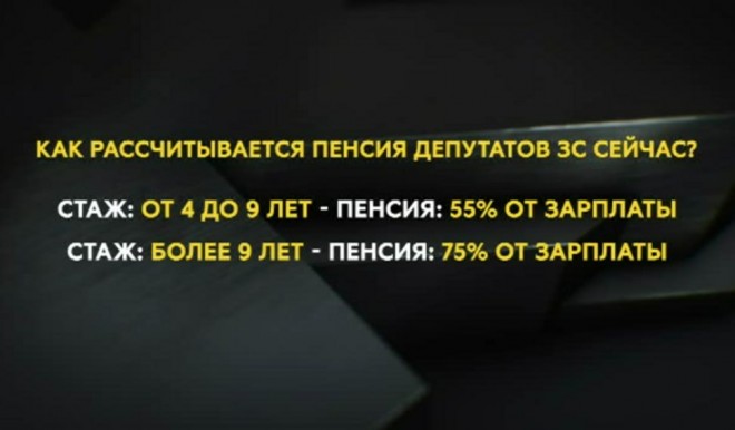 Депутаты хотят увеличить выплаты для тех, кто отработал в парламенте более 9 лет на постоянной основе, то есть получал зарплату. Сейчас у таких народных избранников пенсия и ежемесячная доплата к ней в сумме составляют 75% от зарплаты.