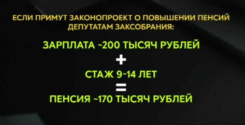 Другой источник ТВК, близкий к парламенту, отмечает, что пенсия бывшего депутата сейчас доходит примерно до 90-100 тысяч рублей. Но непонятно, какой стаж был у такого депутата и какую зарплату он получал. Но если предположить, что сейчас депутат получает как минимум 200 тысяч рублей, и стаж его – от 9 до 14 лет (это примерно два депутатских срока), то в случае принятия поправок он получит пенсию около 170 тысяч рублей. То есть примерно в 10 раз больше, чем обычный пенсионер.