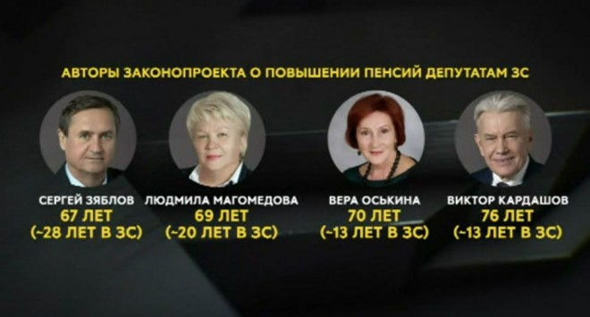 Авторы инициативы – 8 депутатов от «Единой России». Дольше всех в Заксобрании – Сергей Зяблов, ему 67, кресло депутата он занял еще в 1997 году. Людмила Магомедова, ей 69, в парламенте – 20 лет. Вера Оськина – ей 70, в Заксобрании – 13 лет. Столько же – Виктор Кардашов, ему 76.