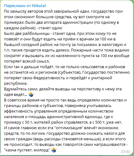 Но мы только затянем эту процедуру, потеряем очень важное время, которое можно было бы направить на развитие муниципальных образований за счет усиления их экономического потенциала».