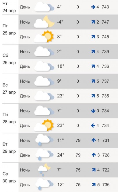 В субботу, 26 апреля, синоптики прогнозируют до +18°C днем. Будет пасмурно. В воскресенье, 27 апреля, в городе потеплеет до +23°C, плюсовая температура будет и ночью.