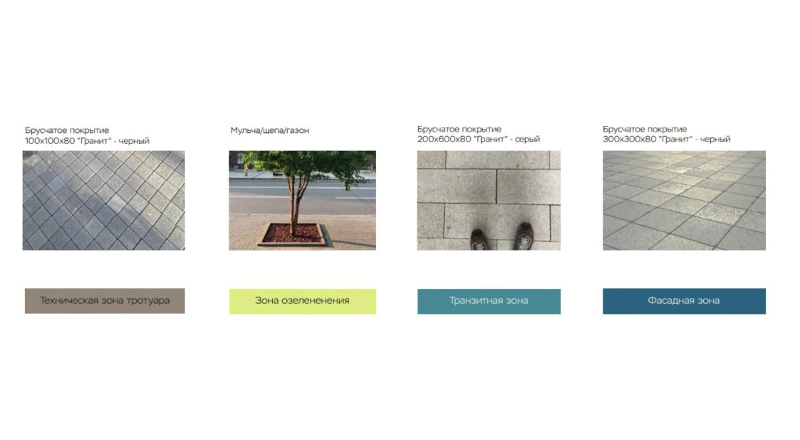 Пешеходная часть – это основной этап работы. Зоны планируют расширить, а оформят улицы в едином стиле. Например, на каждой – свое покрытие. На фасадной, там где ставят столики сезонных кафе, уличную мебель – черный гранит, на транзитной, где и ходят пешеходы – серый, как и на технической. На этой зоне – освещение, светофоры, знаки и рекламные баннеры. В последних двух случаях меняется только размер материала.