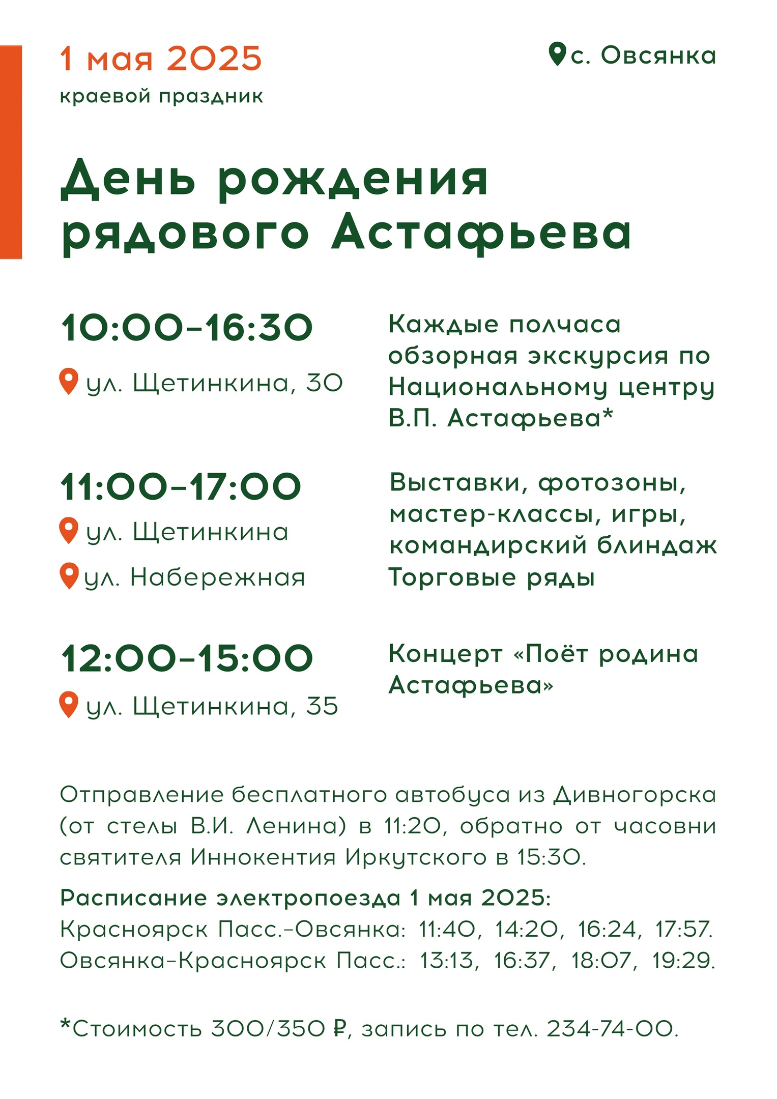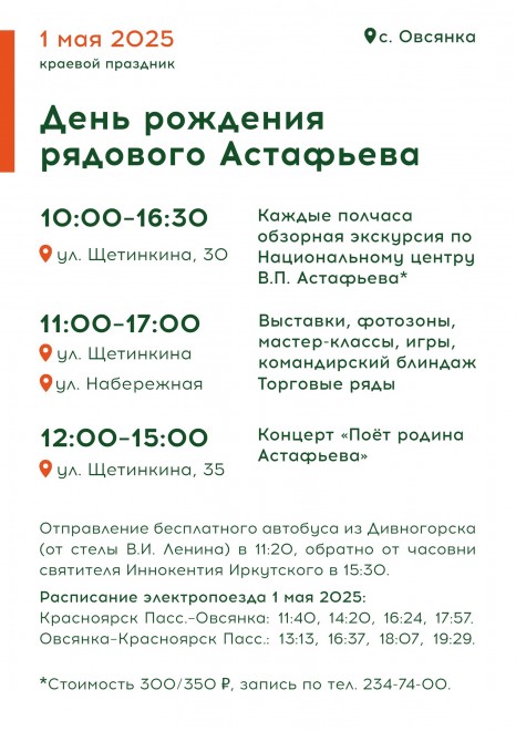 1 мая – день рождения Виктора Астафьева, а вместе с ним и первый день рождения Национального центра. В честь этого в Овсянке проведут большой праздник «День рождения рядового Астафьева».